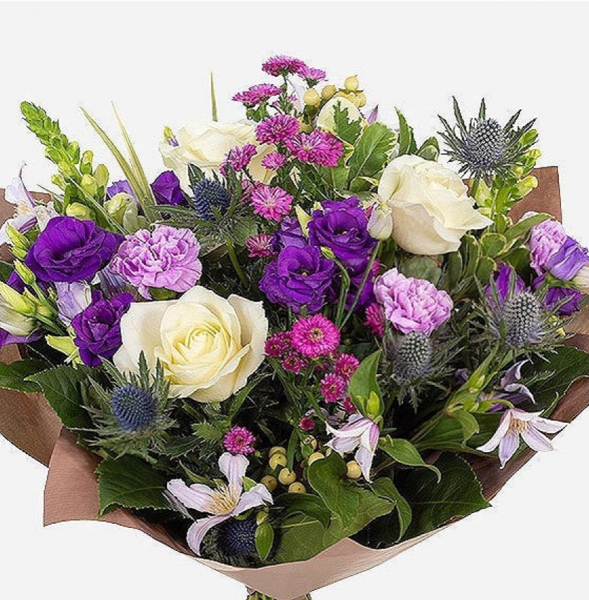 Bouquet of Fresh flowers, Roses, Carnations, Eyrnguims, Lisianthus, Statis and fresh Foliage arranged in water, gift wrapped in Presentation Box or Gift Bag. Florist Choice Design.