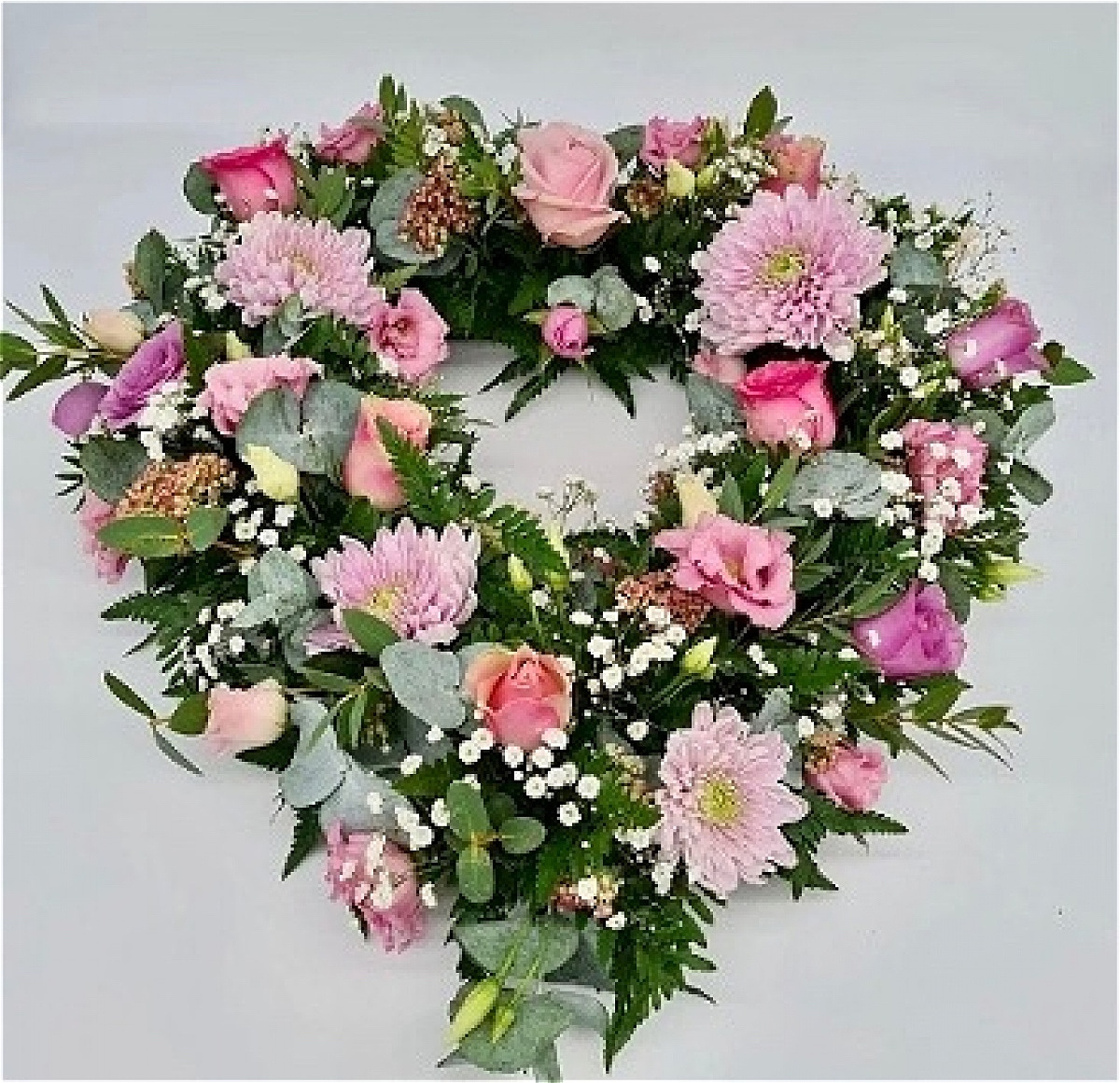 A  Garden Heart Wreath of Fresh Flowers and assorted Foliage A sentimental tribute for a loved one.  Flowers Roses, Freesia, Gypsophlia, Chrysanthemums, Lisianthus.