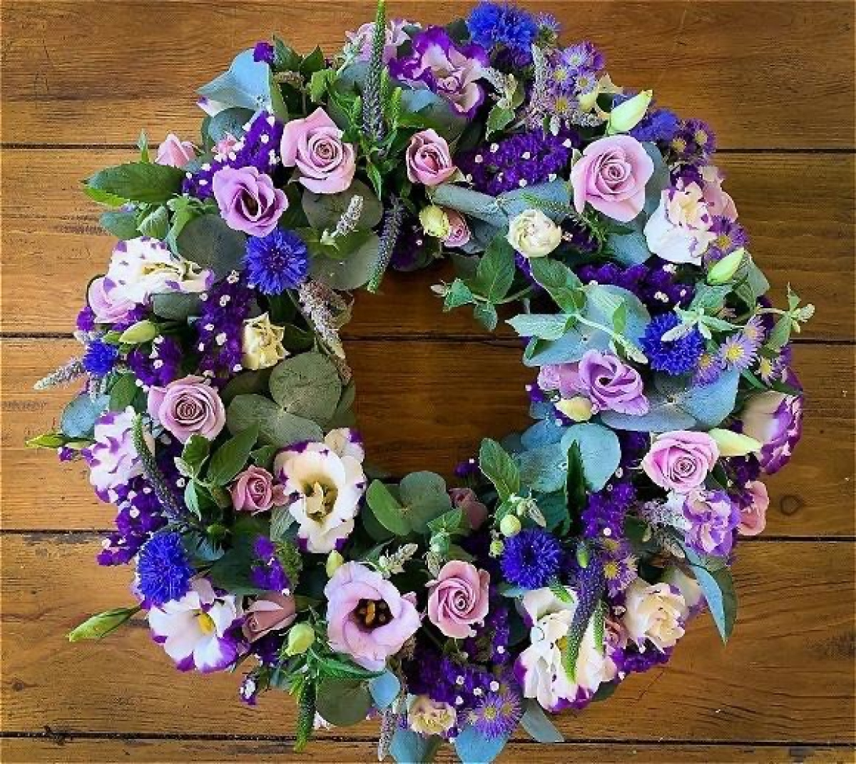 Wreath of Fresh Flowers, Roses, Carnations, Lisianthus, Chrysanthemum and seasonal Foliages. We liaise with Funeral Parlour for appropriate time of delivery.