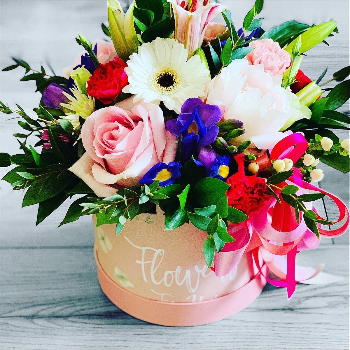 A Thoughtful gift arrangement for All Occasions, beautifully designed Fresh Flowers & Seasonal Foliages. Florist Choice Designed, Roses, Gerberas, Lisianthus , Carnations and Fresh Foliages.