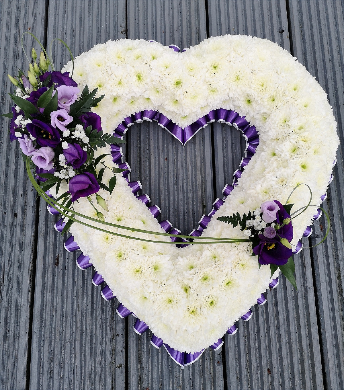 Tribute is massed in Chrysanthemum with a beautiful Spray of Roses, Lisianthus, chrysanthemums, Carnations, Foliages and matching Ribbon.