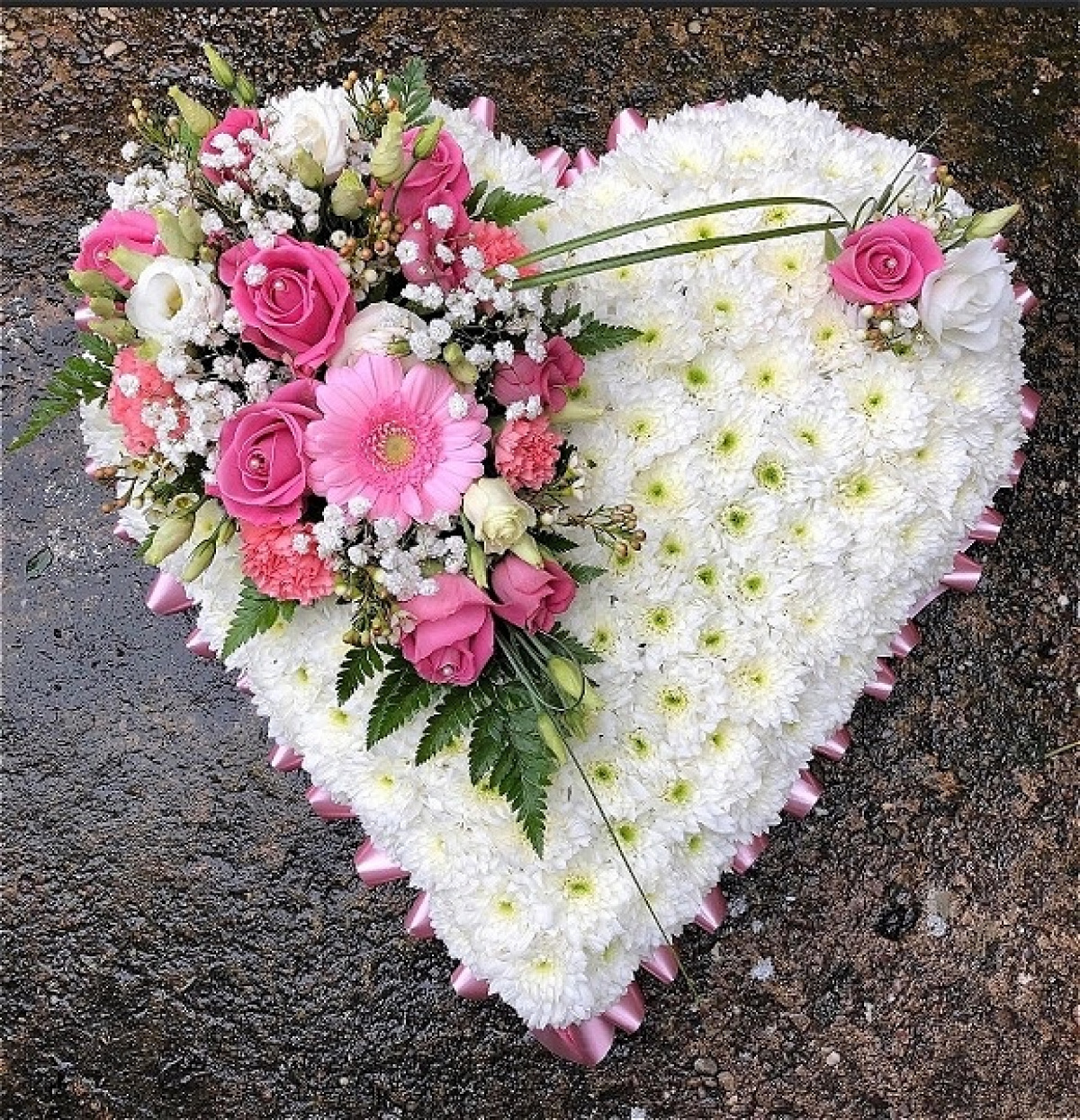 Heart Tribute based with Chrysanthemums, Floral Spray with Roses, Carnations, Chrysanthemums , Lisianthus, Foliage and Complimenting Ribbon.