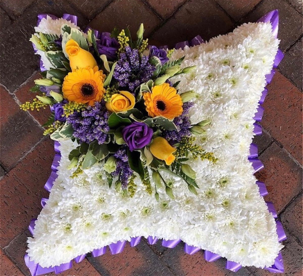 A Beautiful Pillow based in Chrysanthemums with a Spray of fresh flowers with Roses, Gerbera, Carnations, Statis and Foliage, Tribute has a spray with a matching coloured ribbon.