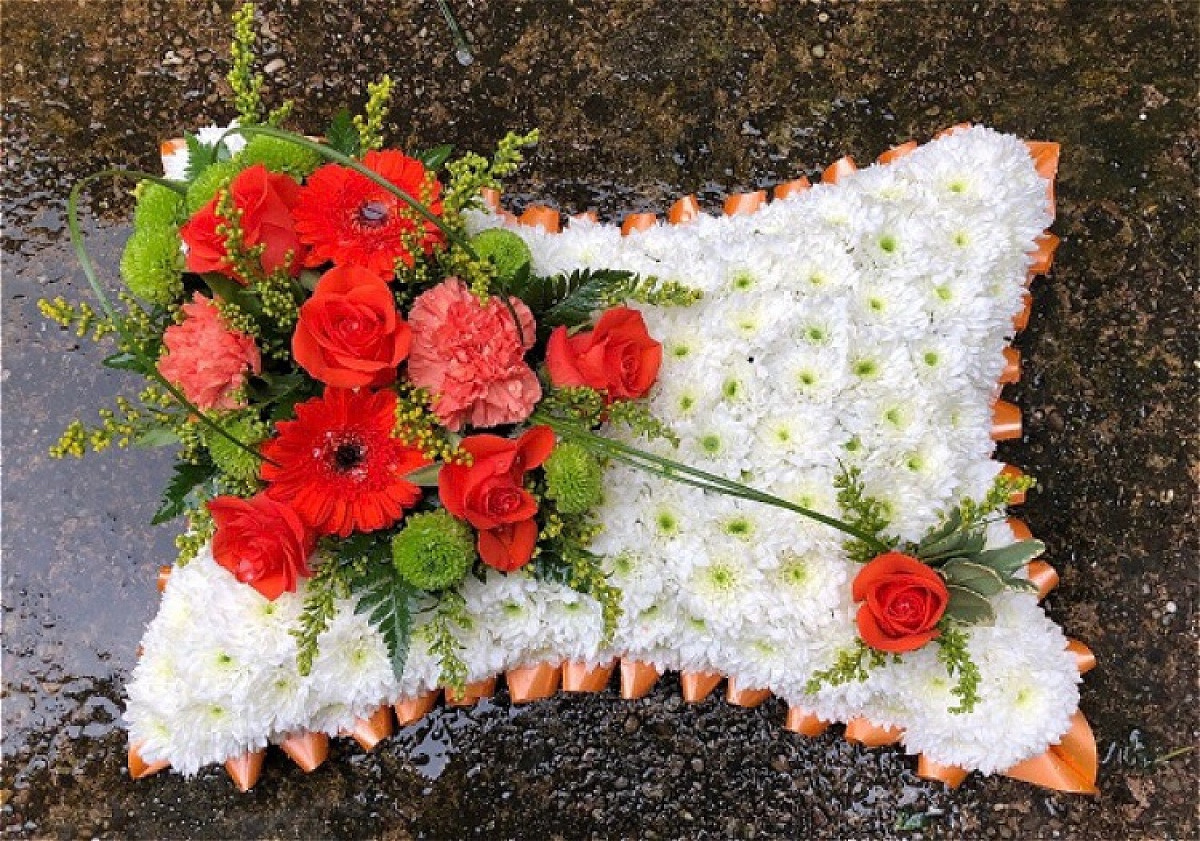A Beautiful Pillow based in Chrysanthemums with a Spray of fresh flowers with Roses, Gerbera, Carnations, Statis and Foliage, Tribute has a spray with a matching coloured ribbon. Pillow 46cm