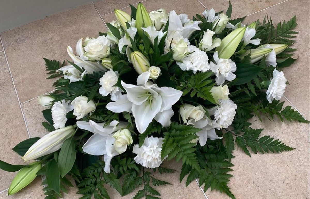 Florist created double ended spray with White Roses, Lilies, Carnations, Lisianthus and Seasonal Mixed Foliages .